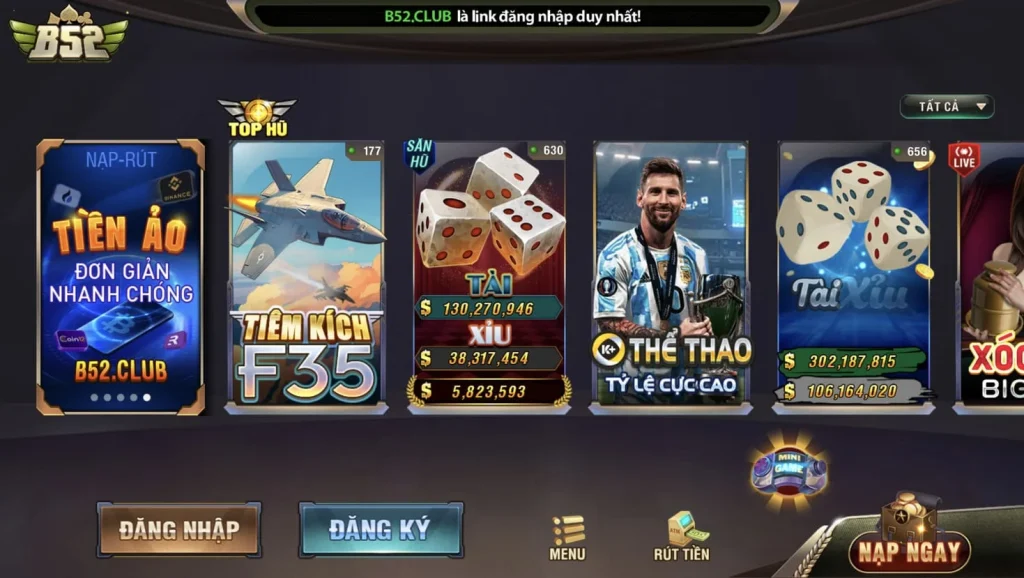 B52 club là nền tảng game trực tuyến tập trung vào tính ổn định, giao diện thân thiện và tốc độ xử lý phiên. Sảnh tài xỉu mở thường xuyên, hiển thị kết quả rõ ràng, lịch sử phiên dễ tra cứu. Tùy khẩu vị, bạn có thể chọn Tài Xỉu 3D để đã mắt, Livestream để tương tác, MD5 để kiểm tra băm kết quả, hay nổ hũ để săn jackpot. Song song đó là hệ sinh thái game kề cận như poker, tiến lên, slot game… giúp bạn đổi gió bất cứ lúc nào mà không cần rời nền tảng.